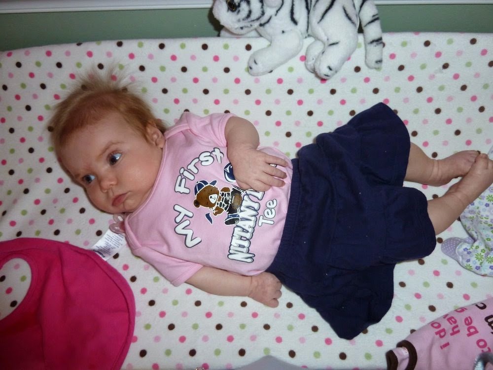 Tomorrow Annabelle will be 4 months old! This past week I found that some of her 0-3 month pj's are to small and the 3-6 month ones fit now. After a few diaper accidents I also realized she's ready for size 2 diapers. She's getting so big, our four month doctor appointment is Wednesday so we will see how much she has grown in the past month. I weighed her last week and she was 11 pounds, 6 ounces.